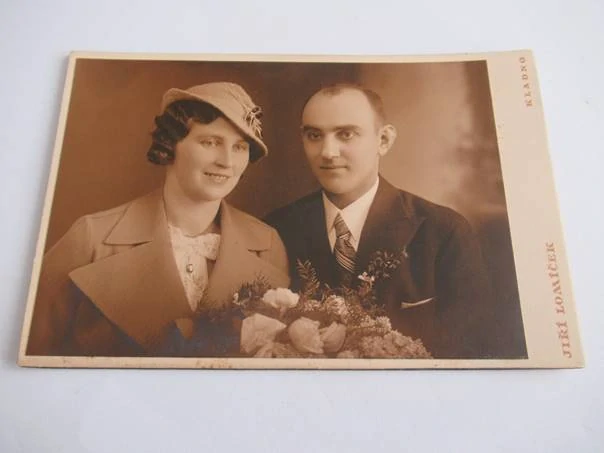 Kladno - Atelier Jiří Lomíček - Muž a žena s kyticí - cca 16 x 10,5 cmSkladem 1 ks150 Kč/ ks
