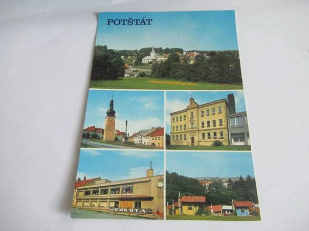 Potštát - celkový pohled, náměstí, základní škola, prodejna jednoty, chatová osadaSkladem 1 ks30 Kč/ ks