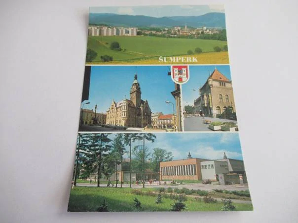 Šumperk - celkový pohled, radnice, divadlo, nová základní školaSkladem 1 ks25 Kč/ ks
